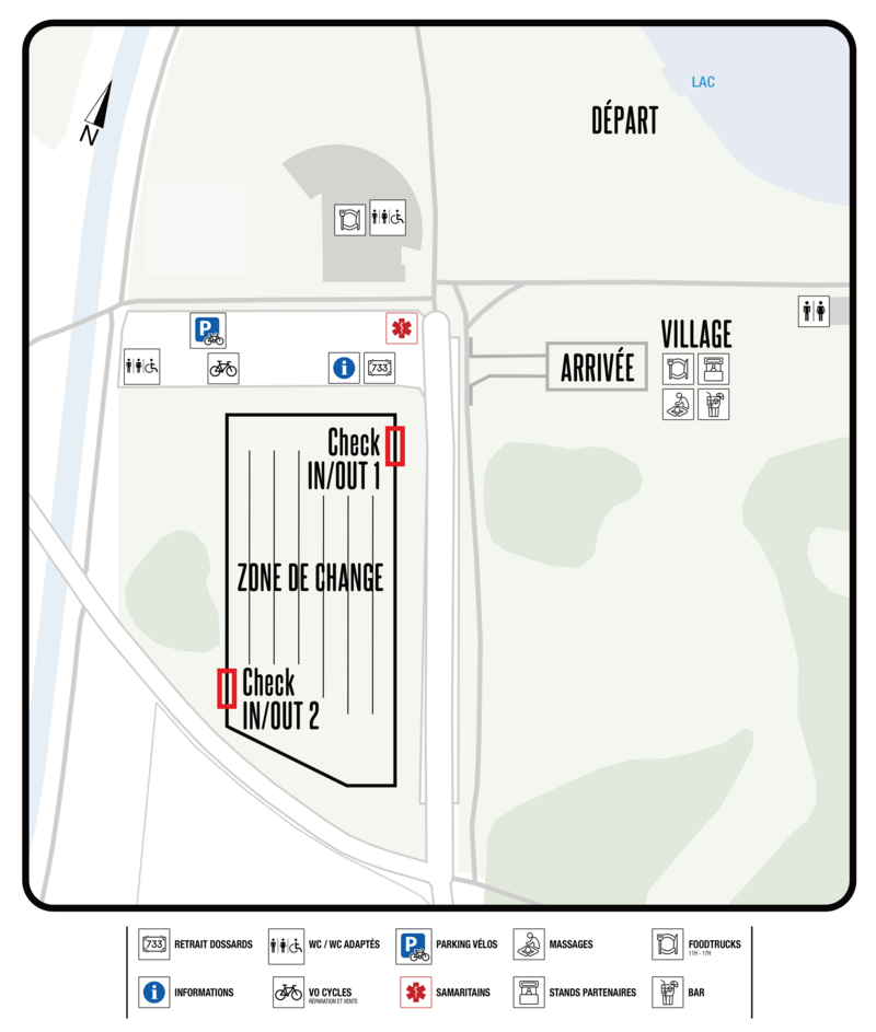 On entre dans la zone de change par le CHECK IN qui est l’endroit où le matériel est contrôlé (combinaison, vélo, casque). Le CHECK IN se fait avant d’entrer dans la zone de change/transition.